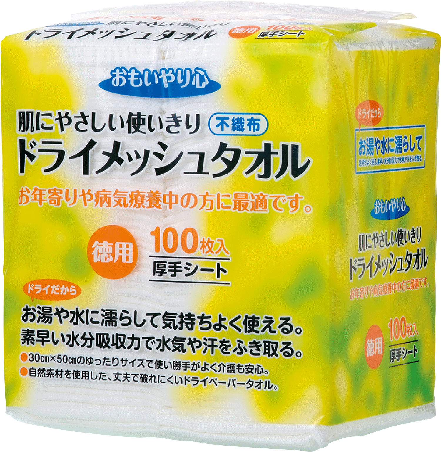 肌にやさしい。使い切りタイプ。自然素材を使用。 お湯や水に濡らして拭ける厚手タイプ。破れにくいドライ不織布タオル。